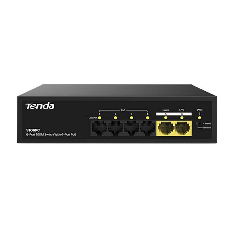 - S106PC là switch PoE 100M unmanaged với 4 cổng PoE và 2 cổng uplink, được Tenda thiết kế dành riêng cho các hệ thống giám sát quy mô nhỏ. Thiết bị tương thích với chuẩn PoE AF/AT, có khả năng tự động nhận diện thiết bị cấp nguồn, đảm bảo kết nối an toàn và hiệu quả.