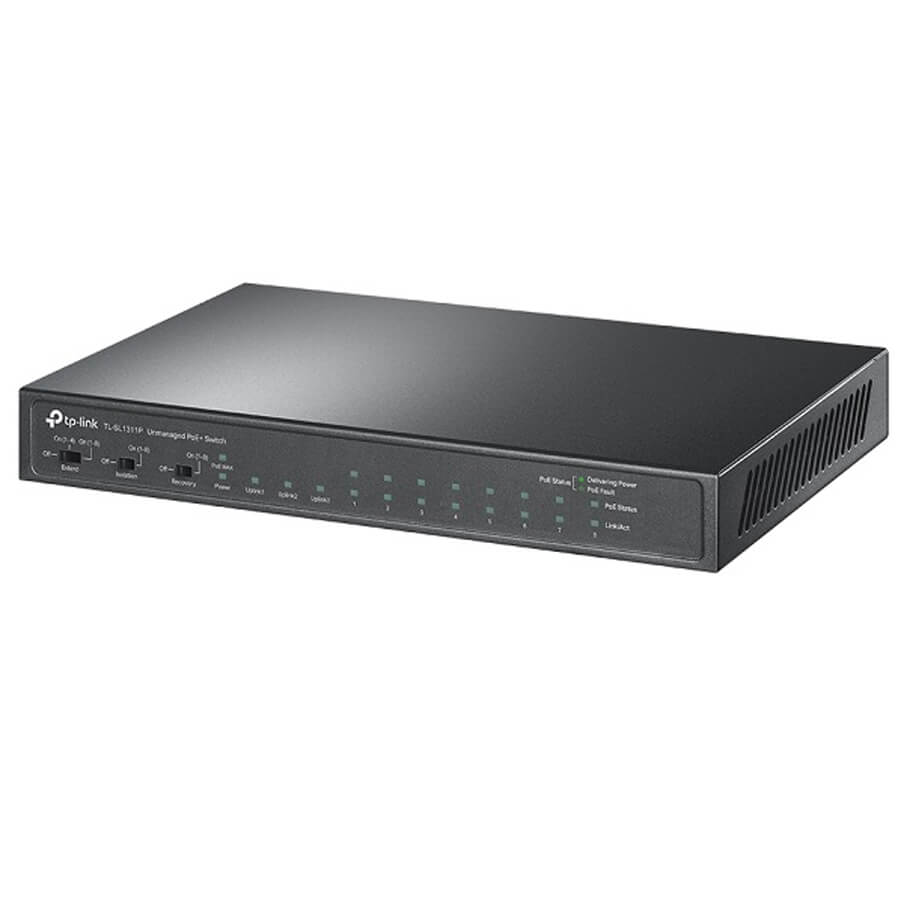 TP-Link TL-SL1311P là switch để bàn 11 cổng (8 cổng PoE+ Fast Ethernet và 3 cổng Gigabit uplink) được thiết kế cho hệ thống mạng nhỏ và vừa, đặc biệt phù hợp với các ứng dụng camera giám sát, Access Point hoặc điện thoại IP. Thiết bị hỗ trợ chuẩn PoE+ IEEE 802.3af/at, cho phép truyền dữ liệu và cấp nguồn qua cùng một sợi cáp mạng, giúp đơn giản hóa việc triển khai hệ thống và tiết kiệm chi phí lắp đặt. Với tổng công suất PoE 65W, chế độ truyền xa tới 250m, cùng 3 cổng uplink Gigabit (2 RJ45 + 1 SFP) giúp mở rộng kết nối linh hoạt, TL-SL1311P mang lại hiệu suất ổn định, bảo mật cao và vận hành êm ái nhờ thiết kế không quạt.