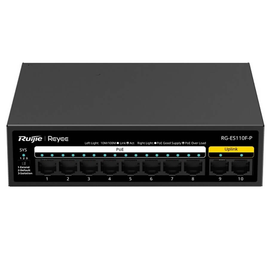 Ruijie RG-ES110F-P là dòng Switch PoE (Power over Ethernet) Unmanaged được thiết kế chuyên biệt cho các hệ thống camera giám sát, văn phòng nhỏ, quán cà phê, cửa hàng bán lẻ hoặc hộ gia đình. Với 10 cổng Fast Ethernet, trong đó có 8 cổng hỗ trợ PoE, thiết bị này không chỉ truyền tải dữ liệu mà còn cung cấp điện trực tiếp cho camera IP, điện thoại VoIP hay Access Point – giúp tiết kiệm tối đa chi phí đi dây và lắp đặt.