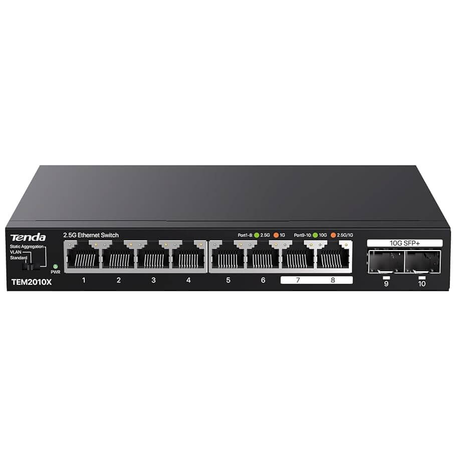 - TEM2010X là switch 2.5G 8 cổng, đi kèm 2 khe cắm 10G SFP+, được Tenda thiết kế để xây dựng hệ thống mạng tốc độ cao cho máy tính, NAS, TV box, Wi-Fi 6/7 APs và nhiều thiết bị khác.