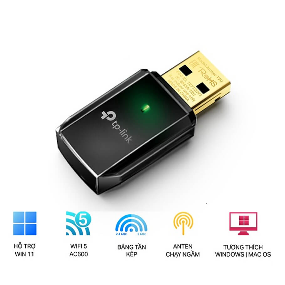 TP-Link Archer T2U là bộ thu USB Wi-Fi nhỏ gọn, hỗ trợ băng tần kép AC600, giúp bạn kết nối Internet nhanh chóng và ổn định. Thiết bị cung cấp tốc độ lên tới 600Mbps (200Mbps trên 2.4GHz và 433Mbps trên 5GHz), lý tưởng để xem video HD, chơi game trực tuyến hoặc làm việc từ xa. Với thiết kế nhỏ gọn và tiện lợi, Archer T2U dễ dàng cắm vào laptop hoặc PC, mang đến trải nghiệm Wi-Fi thế hệ mới mà không chiếm nhiều không gian. Hỗ trợ đầy đủ các chuẩn bảo mật WEP, WPA/WPA2 giúp kết nối luôn an toàn và tin cậy. Archer T2U tương thích với Windows và macOS, là giải pháp đơn giản nhưng mạnh mẽ để nâng cấp khả năng Wi-Fi cho máy tính của bạn.