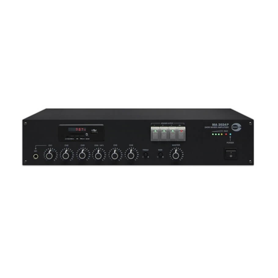 AMPERES MA2024P là bộ khuếch đại công suất 240W chuyên dụng cho hệ thống âm thanh thông báo, phù hợp lắp đặt tại văn phòng, nhà xưởng, trường học hoặc trung tâm thương mại. Sản phẩm được tích hợp sẵn MP3/ Tuner cùng các cổng USB/ SD giúp phát nhạc linh hoạt mà không cần thiết bị ngoài. Khả năng chia vùng thông báo độc lập giúp tối ưu vận hành và quản lý âm thanh hiệu quả. Thiết kế gọn gàng, dễ sử dụng, phù hợp với người dùng phổ thông. Đây là lựa chọn đáng tin cậy cho hệ thống PA chuyên nghiệp.