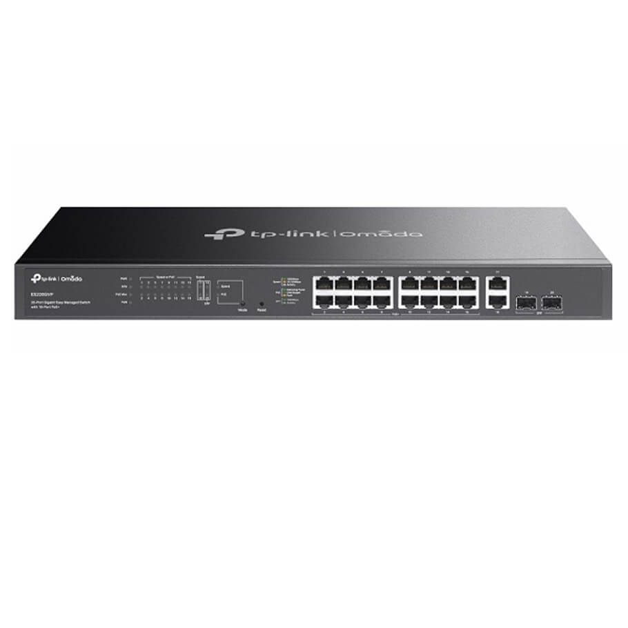 TP-Link Omada ES220GMP là switch Gigabit thông minh với 20 cổng kết nối, trong đó có 16 cổng PoE+ chuẩn 802.3af/at cùng tổng công suất nguồn lên đến 250W. Thiết bị được thiết kế để đáp ứng nhu cầu hạ tầng mạng lớn, có khả năng cấp nguồn trực tiếp cho nhiều camera IP, điện thoại VoIP, điểm truy cập Wi-Fi và các thiết bị IoT công suất cao.