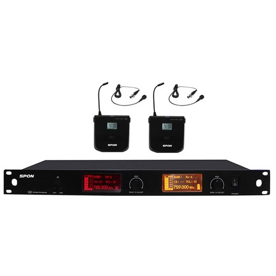 - Bộ micro không dây choàng đầu SPON LCS-2330T gồm 2 micro choàng đầu + 2 bộ phát và 1 bộ thu kênh đôi độc lập. Micro sử dụng băng tần UHF 603-935 MHz cho phép chọn 32 kênh và khoảng cách thu phát tới 90m (không vật cản). Micro thích hợp dùng trong hội trường, sân khấu phát biểu, đào tạo, giảng dạy.