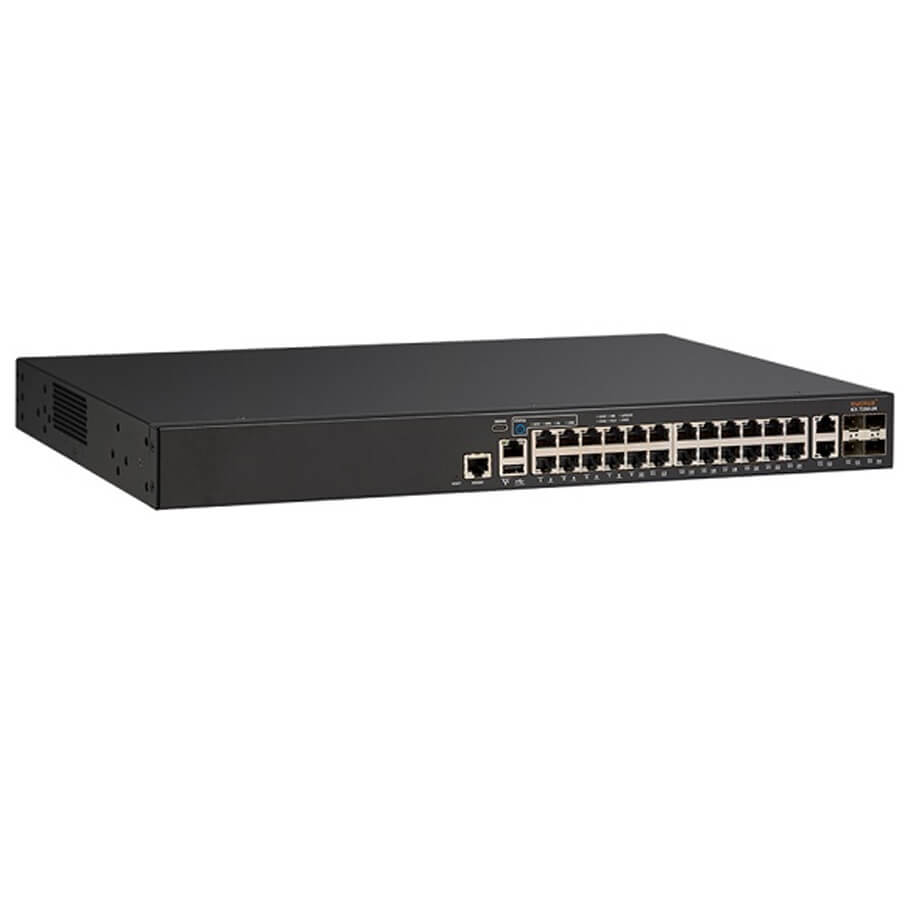 - Switch cung cấp 24 cổng RJ45 10/100/1000 Mbps cho tầng truy cập, phục vụ kết nối các thiết bị đầu cuối trong hệ thống mạng doanh nghiệp như máy trạm, IP Phone, Access Point và thiết bị IoT.