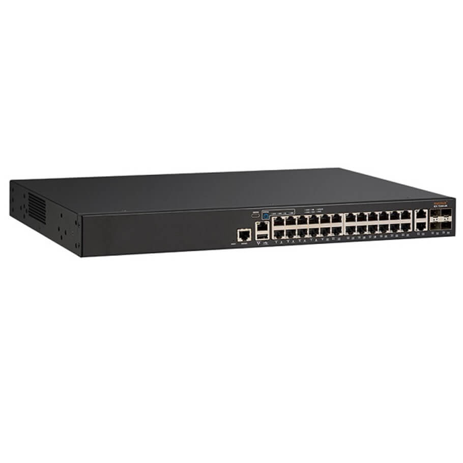 - Switch tích hợp 2 cổng uplink RJ45 1GbE dùng để kết nối lên router hoặc switch phân phối bằng cáp đồng, đồng thời có 4 cổng uplink SFP 1GbE cho kết nối quang. Các cổng SFP này có thể nâng cấp lên SFP+ 10GbE bằng license, giúp mở rộng băng thông uplink khi hệ thống phát triển mà không cần thay thiết bị.
