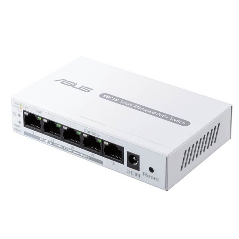 - ASUS ExpertWiFi EBP15 là thiết bị chuyển mạch thông minh (smart managed switch) với 5 cổng Gigabit Ethernet, trong đó có 4 cổng hỗ trợ PoE+ (Power over Ethernet Plus), cung cấp tổng công suất lên đến 60W. Thiết bị lý tưởng để cấp nguồn và truyền dữ liệu đồng thời cho các thiết bị hỗ trợ PoE như Access Point WiFi, camera IP, điện thoại VoIP, giúp giảm thiểu dây nguồn rườm rà và tối ưu không gian lắp đặt.