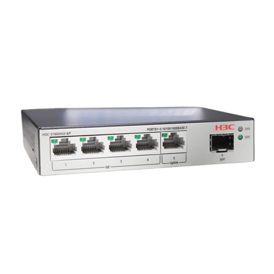 - H3C S1600V2-6P là dòng switch Gigabit thuộc series S1600V2, được thiết kế nhỏ gọn nhưng vẫn đáp ứng tốt nhu cầu kết nối mạng tốc độ cao cho các văn phòng vừa và nhỏ, cửa hàng, lớp học hay hộ gia đình cao cấp. Với 5 cổng Gigabit RJ45 và 1 khe cắm SFP, thiết bị giúp linh hoạt mở rộng kết nối, đồng thời tối ưu băng thông cho nhiều ứng dụng.