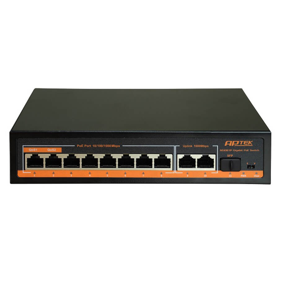 - APTEK SG1083P là bộ chuyển mạch không quản lý (Unmanaged switch) 8 port PoE chuẩn 802.af/at, sử dụng linh hoạt trong nhiều môi trường khác nhau như doanh nghiệp, trường học, bệnh viện và gia đình. Sản phẩm thiết kế nhỏ gọn, tính năng vượt trội cùng chi phí hợp lý, phù hợp với mô hình mạng Wi-Fi Gigabit và hệ thống camera IP một cách tiện dụng, không phải cấu hình mà vẫn đảm bảo tính ổn định, hiệu năng cao.