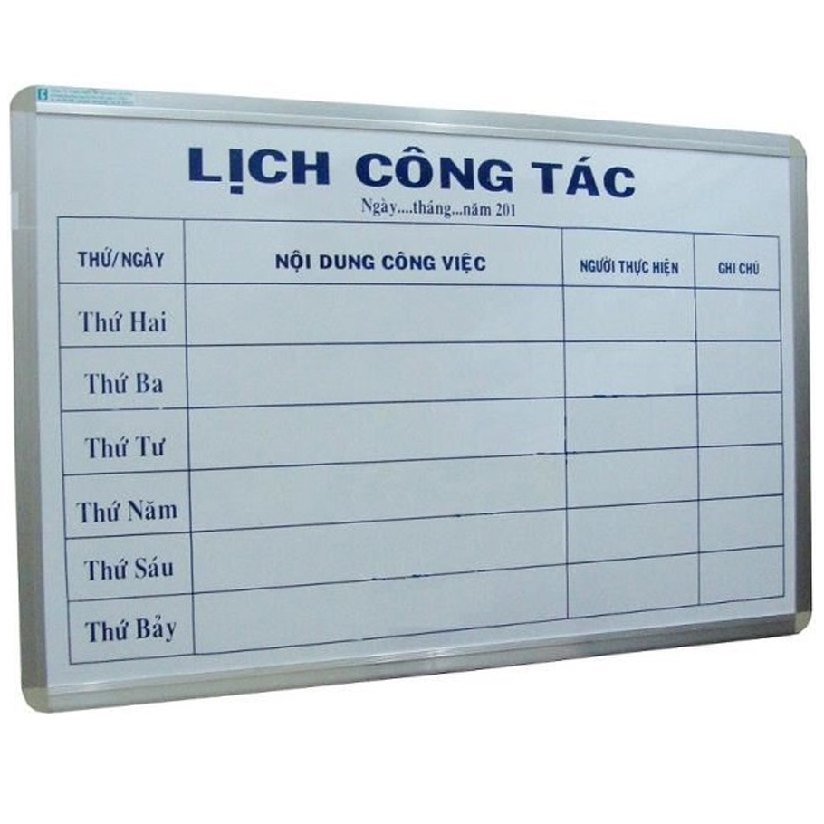- Mặt bảng màu trắng bạch in lụa màu xanh biển theo mẫu lịch công tác, chất liệu chính bằng Greenlam nhập khẩu từ Ấn Độ, viền khung nhôm hộp. Sản phẩm cao cấp với nguyên liệu ngoại nhập.