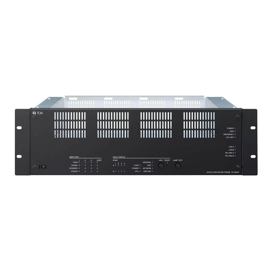 TOA VX-3004F là khung quản lý trung tâm dạng rack, thuộc dòng VX-3000, được chứng nhận theo tiêu chuẩn châu Âu EN 54-16. Thiết bị cung cấp 4 kênh đầu ra cho các đường loa AB, mỗi kênh có bộ khuếch đại riêng. Khung này cho phép gắn tối đa 4 module ampli với các công suất khác nhau, một trong số đó có thể sử dụng như ampli dự phòng chia sẻ giữa các khung khác. VX-3004F thiết kế dễ dàng lắp và tháo các module, thích hợp cho các hệ thống công cộng và thông báo khẩn cấp.
