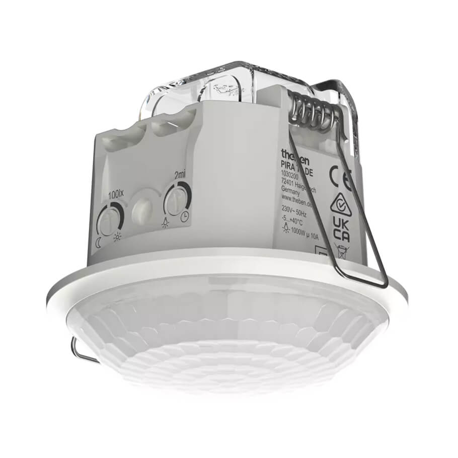 Theben PIRA T8 DE là cảm biến hiện diện/chuyển động hồng ngoại thụ động (PIR) lắp âm trần, thiết kế dành cho các không gian trong nhà như nhà vệ sinh, kho, hành lang hoặc khu vực lưu trữ. Với góc quét 360° và vùng phát hiện lên đến Ø 8m (50m²), thiết bị giúp kiểm soát chiếu sáng tự động hiệu quả trong không gian vừa và nhỏ. Sản phẩm hoạt động hoàn toàn tự động dựa trên chuyển động và độ sáng môi trường, giúp tối ưu hóa việc sử dụng điện năng. Nhờ tích hợp công nghệ đo ánh sáng liên tục và mạch zero-crossing, thiết bị đảm bảo bật/tắt đèn chính xác, ổn định, đặc biệt với đèn LED. Thiết kế đầu nối cắm nhanh giúp việc lắp đặt trở nên dễ dàng và nhanh chóng.