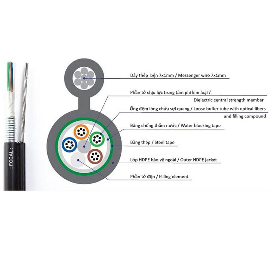- Cáp quang treo kim loại Singlemode FOCAL được dùng như cáp treo ở những tuyến cáp quan trọng hoặc những đoạn băng rừng, nơi có nhiều sinh vật gặm nhấm.