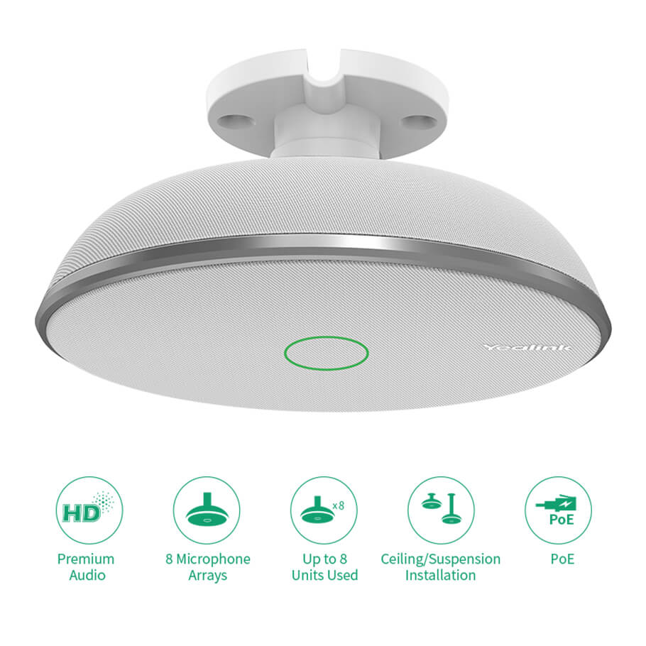 - YVCM38 là một micro gắn trần được thiết kế mới với 8 micro tích hợp, hỗ trợ thu âm thanh 360 độ. Thiết bị này cung cấp chất lượng âm thanh xuất sắc nhờ công nghệ khử tiếng vọng cao cấp và công nghệ chống ồn của Yealink. Với công nghệ Beamforming, VCM38 có thể tự động định vị và tối ưu hóa việc thu âm cho người đang nói. Một đơn vị VCM38 có thể bao phủ diện tích 40m2, và có thể mở rộng phạm vi cho các phòng họp lớn bằng cách sử dụng tối đa tám đơn vị trong một hệ thống.