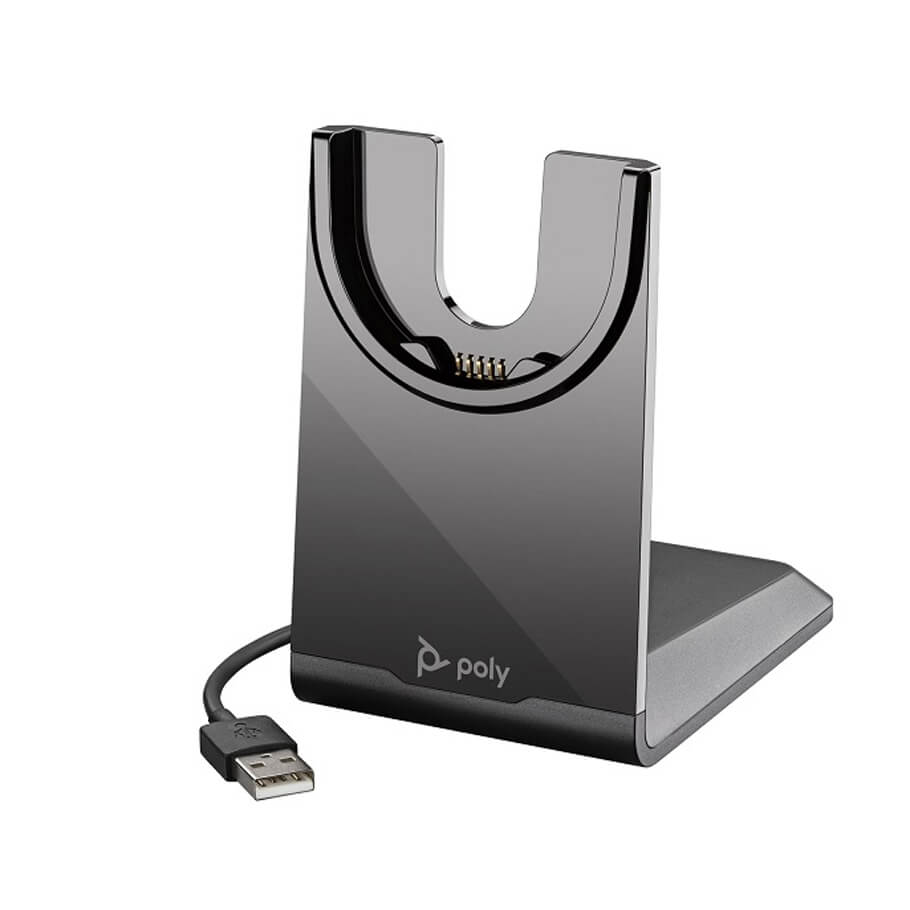 - Chân đế sạc Poly Voyager USB-A Charging Stand được sử dụng cho dòng tai nghe Voyager Focus 2 và Voyager 4300 UC.
