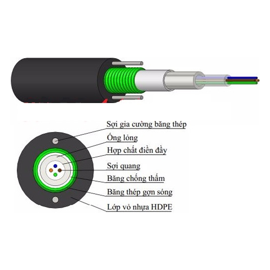 - Vỏ cáp bằng nhựa HDPE ngăn ngừa được các loài gặm nhấm, được thiết kế để bảo vệ những tác động cơ học của môi trường và lắp đặt, sử dụng.