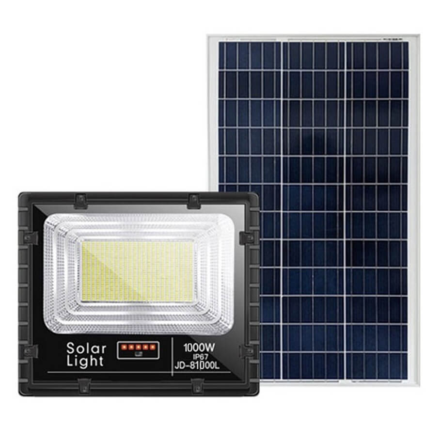 - Đèn pha led năng lượng mặt trời 500W JD-8500L JINDIAN có thân khung vỏ đèn được làm từ nhôm đúc nguyên khối rất chắn chắc, bên ngoài được sơn phũ lớp tĩnh điện chống rò rỉ tốt. Đèn có chỉ số bảo vệ IP67, đạt tiêu chuẩn chống nước, chống ẩm, chống bụi bẩn gần như tuyệt đối, nên mọi người có thể hoàn toàn yên tâm đèn có thể hoạt động ổn định kể cả khi lắp đèn ở khu vực ngoài trời. Với công suất hoạt động lên đến 1000W, đèn thích hợp sử dụng cho công trình có diện tích rộng lớn như sân bóng mini, sân Tennis, ao tôm,…