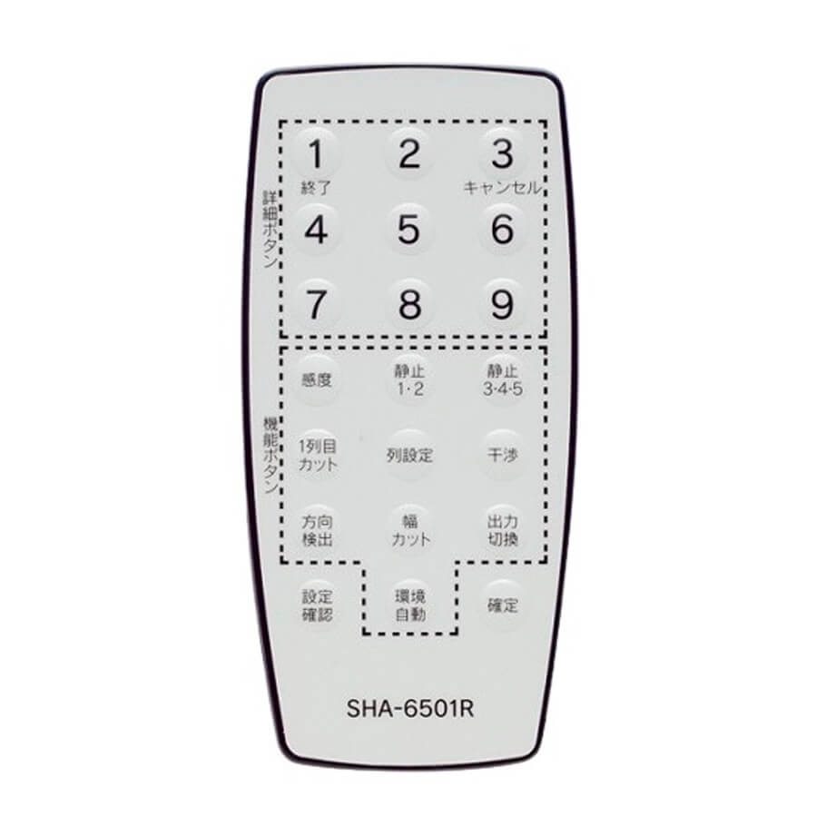 - SHA-6501R là điều khiển từ xa dùng để cài đặt thông số cho các cảm biến dòng SHA-6500 (ví dụ SHA-6502). Thiết bị này hoạt động bằng pin tiểu (loại AA), và có thể truyền tín hiệu trong phạm vi dưới 7 mét, tùy thuộc vào điều kiện lắp đặt.