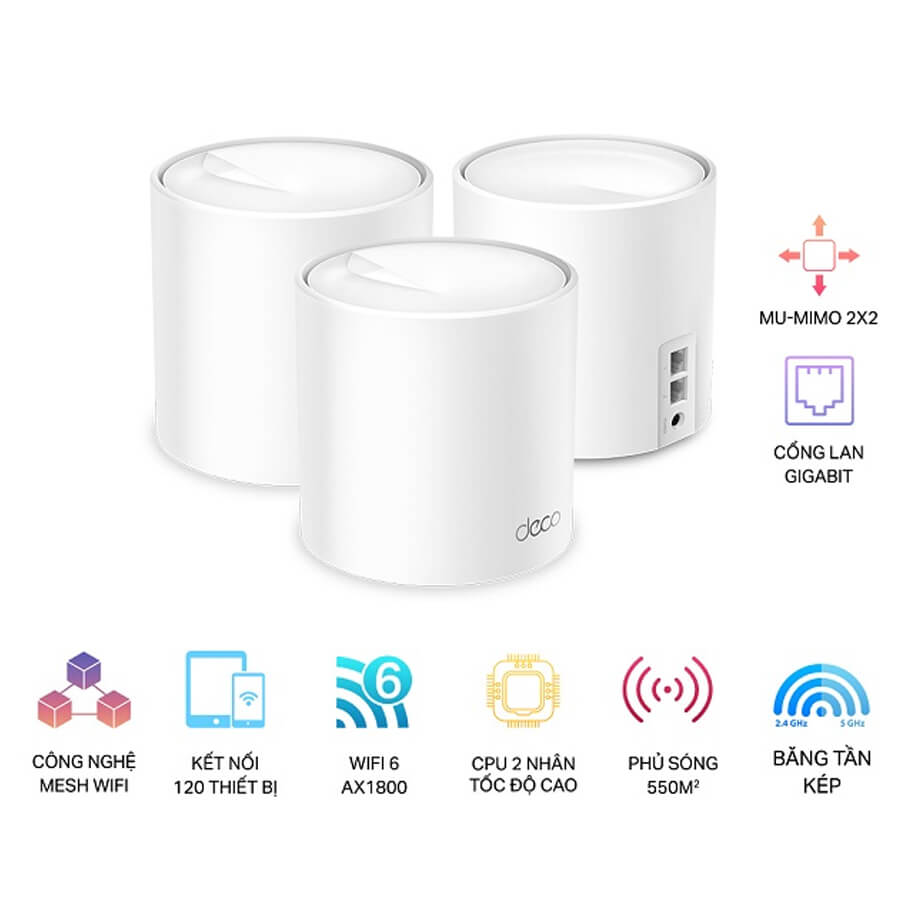 - Bộ 03 thiết bị Deco X20 có thể bao phủ không gian rộng tới 530m². Nhờ công nghệ Beamforming (tập trung sóng Wi-Fi đến thiết bị) và BSS Color (giảm nhiễu sóng từ các mạng khác), tín hiệu luôn ổn định và mạnh mẽ ở mọi vị trí trong nhà.