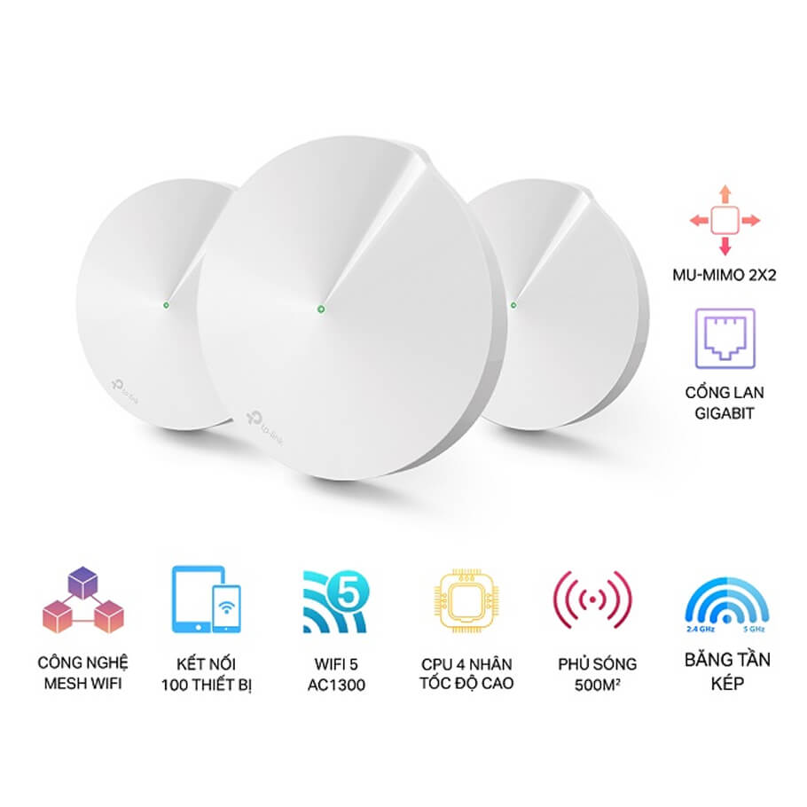 - Bộ 3 thiết bị Deco M5 có khả năng phủ sóng lên đến 500m², lý tưởng cho căn hộ lớn hoặc nhà nhiều tầng.