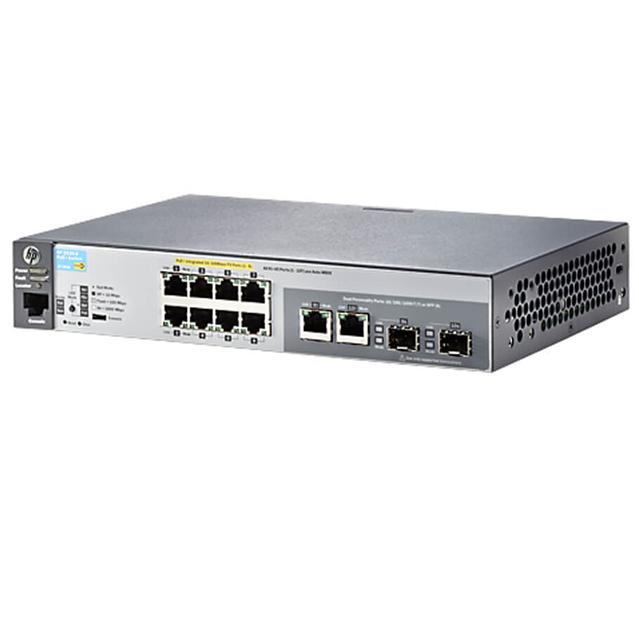 - 8 RJ-45 autosensing 10/100 PoE ports, 2 dual-personality ports; RJ-45 10/100/1000 or SFP slot.