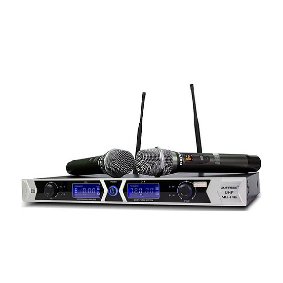 - Micro không dây GUINNESS MU-116 nổi bật với thiết kế không dây, tiện lợi, dễ sử dụng. Receiver nhỏ gọn không bị vướng víu, giúp bạn có thể mang theo bất cứ đâu.