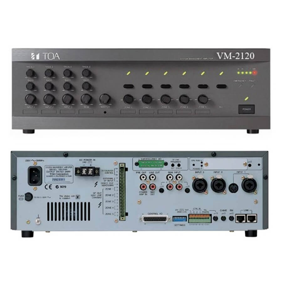 - VM-2120 là tăng âm ''All-in-one'' hỗ trợ 5 vùng loa riêng biệt với công suất tối đa lên tới 120W và có thước 3U. Tăng âm có các ngõ vào âm thanh bao gồm ngõ vào Micro và cho nhạc nền, và ngõ ra loa. Có sẵn 5 núm điều chỉnh âm lượng và phím chọn vùng cho từng vùng loa riêng.