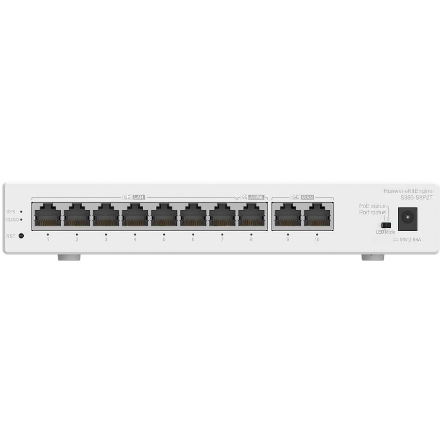S380-S8P2T thuộc dòng Huawei eKitEngine S380 là cổng dịch vụ đa năng (Multi-Service Gateway) tích hợp định tuyến, chuyển mạch WAC và hỗ trợ PoE, với 8 cổng LAN GE và 2 cổng WAN GE. Với các tính năng cài đặt và triển khai dễ dàng cùng mạng Ethernet linh hoạt, thiết bị phù hợp cho phủ sóng trong nhà ở các thị trường doanh nghiệp vừa và nhỏ (SME), bao gồm: Văn phòng doanh nghiệp SOHO, khách, nhà máy, giáo dục tiểu học và trung học, an ninh tòa nhà.
