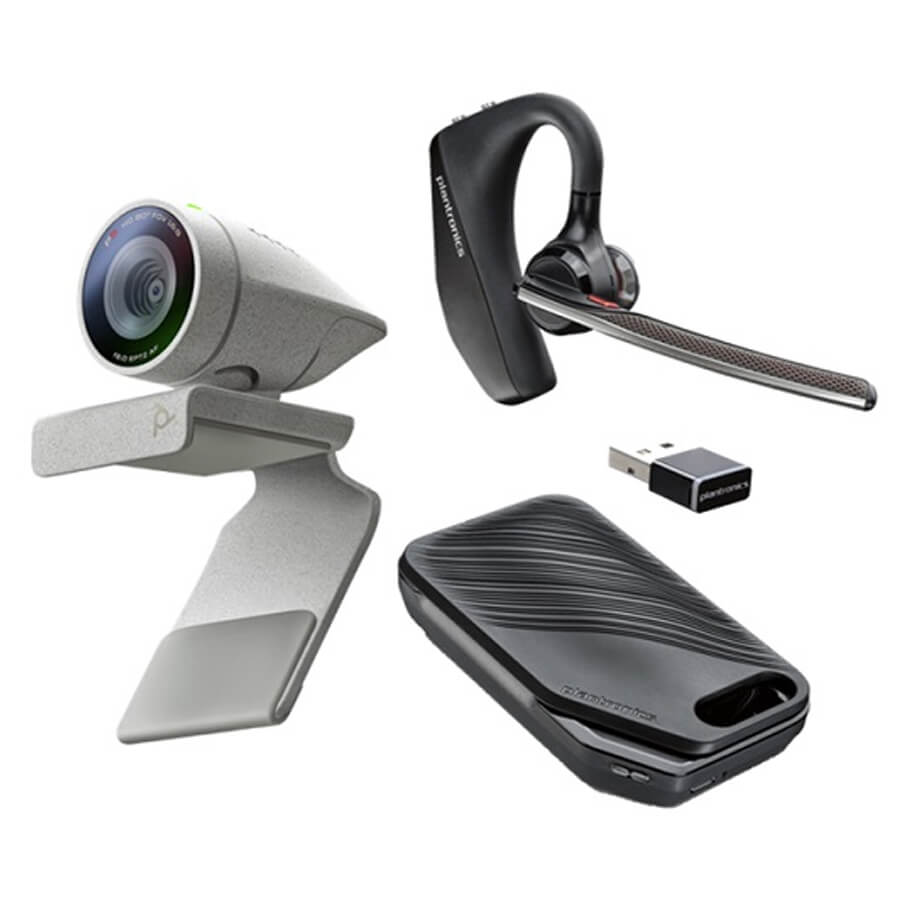 - Polycom Studio P5 Kit bao gồm camera hội nghị Studio P5 và tai nghe chống ồn không dây Stereo Voyager 5200 UC.