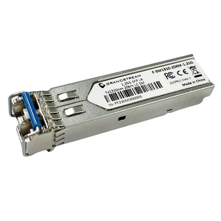 - Grandstream F-SM1310-20KM-1.25G là mô-đun thu phát sợi quang đơn chế độ dành cho mạng quang đường dài. Với khoảng cách truyền tối đa là 20 km, hỗ trợ truyền dẫn cáp quang với bước sóng danh định là 1310 nm. F-SM1310-20KM-1.25G là mô-đun SFP có tốc độ dữ liệu 1,25 Gbps.
