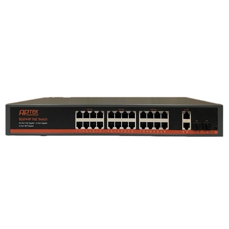 - Bên cạnh 24 cổng Gigabit RJ45 chuẩn PoE, APTEK SG11244P có thêm 2 cổng Gigabit RJ45 Uplink và 2 cổng SFP Gigabit Uplink.