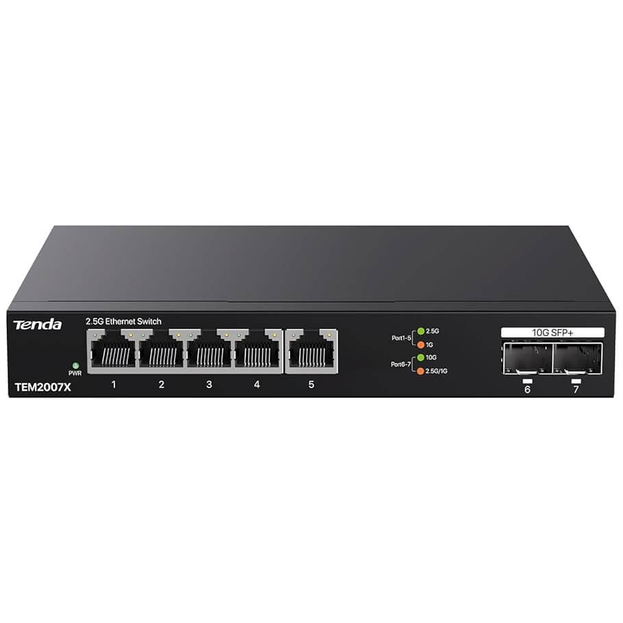 - TEM2007X là Switch 2.5G 5 cổng với 2 khe cắm 10G SFP+ được Tenda thiết kế độc lập, giúp xây dựng hệ thống mạng tốc độ cao cho máy tính, NAS, TV box, Wi-Fi 6/7 APs và nhiều thiết bị khác.