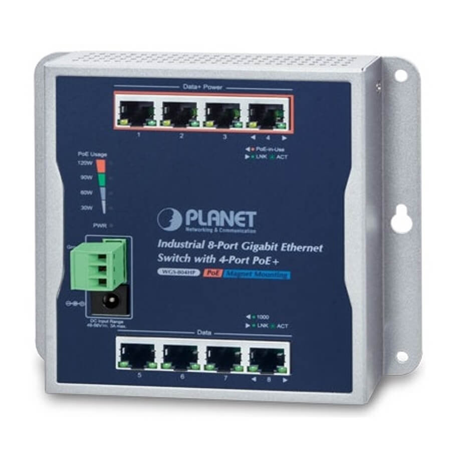 - Wallmount Industrial Switch PoE Planet WGS-804HP là bộ chia mạng tốc độ Gigabit PoE có thiết kế kiểu gắn tường, cung cấp 8 cổng tự động nhận tốc độ 10/100/1000Mbps, trong đó có 4 công Gigabit 802.3af/802.3at PoE+, 30W/port, tổng công suất 120W. Switch công nghiệp gắn tường Planet WGS-804HP có vỏ máy chắc chắn IP30, là giải pháp triển khai mạng công nghiệp tốc độ cao, đồng thời cấp nguồn cho các thiết bị điện thoại IP, camera IP, Wifi AP tại các khu vực có thời tiết khắc nghiệt, đáp ứng nhu cầu về xu hướng cơ sở hạ tầng IIoT (Internet vạn vật công nghiệp) đang phát triển mạnh mẽ.