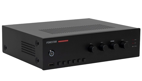 | Features | Public address amplifier. USB/FM player. Microphone input with mix, gain and priority level control. Tone controls. 100 V and 4 Ω outputs. |
