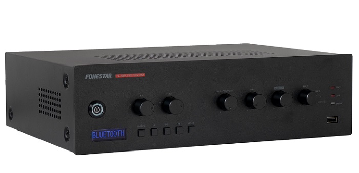 | Characteristics | Public address amplifier Bluetooth/USB/FM player. Microphone inputs with mix, gain and priority level control. Input priorities by signal level. tone controls. 100 V and 4 Ω outputs. 2 output zones with volume control and Off. |