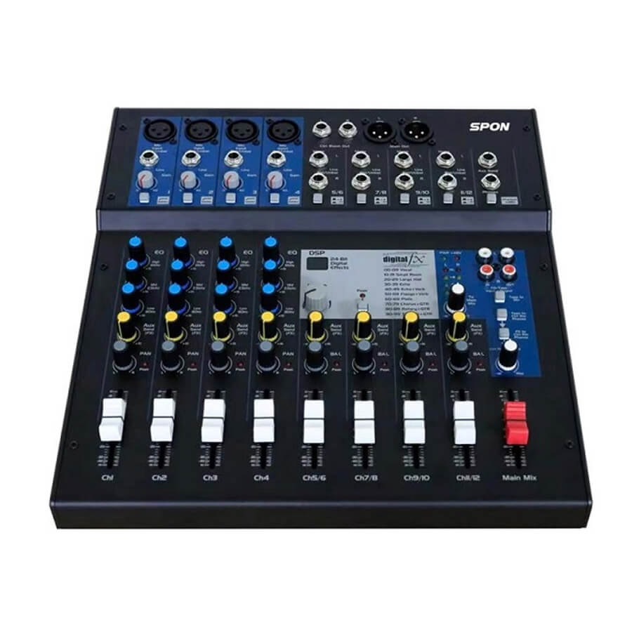 - Trang bị 4 kênh mono, 4 cặp kênh stereo và 12 kênh đầu vào có hiệu ứng.