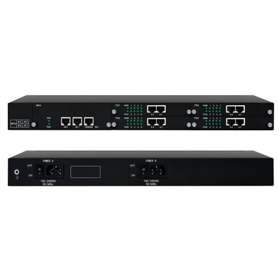 | Physical Interfaces | - Capacity: Range from 8 to 32 FXO/FXS Support 4 user board slots - User Board: 2* RJ45 connectors with 8 FXO 2* RJ45 connectors with 8 FXS - MCU Board: 1*RS232, 115200bps 2*10/100/1000Mbps, RJ45 |