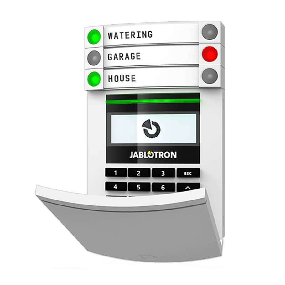 - Bảng điều khiển có dây với đầu đọc từ, bàn phím và màn hình LCD JA-114E là bảng điều khiển tích hợp màn hình LCD, các nút bấm và thiết bị đọc RFID được thiết kế để kiểm soát hệ thống báo động.