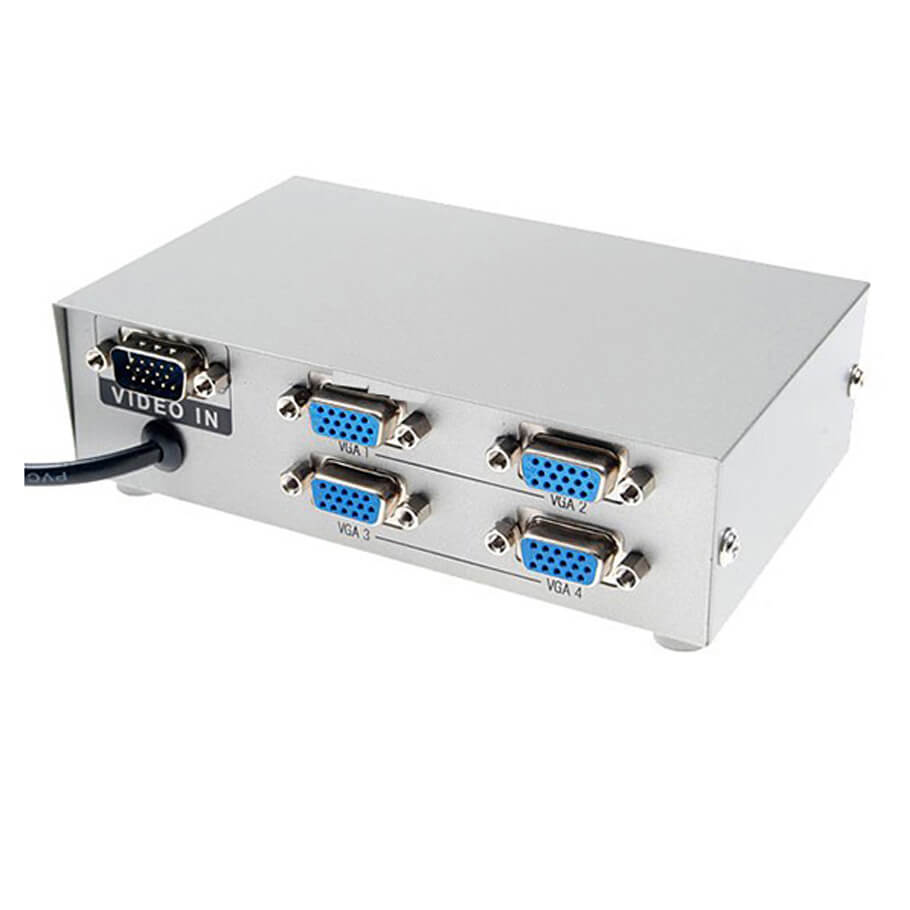 - Bộ chia VGA 4 cổng được sử dụng dùng để chia tín hiệu từ 1 máy tính ra 4 màn hình khác nhau nhưng vẫn đảm bảo được độ phân giải như nhau mặc dù chia ra nhiều màn hình.