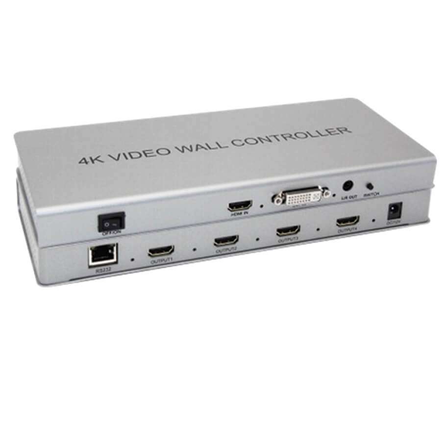 - The 4K 2x2 video wall controller, support 1-way HDMI or DVI input and 4 HDMI output, the main function is to divide a complete HDMI, DVI HD image signal into 4 blocks and assign to 4 video display unit (such as Rear projection unit, LCD TV, etc.), Complete with 4 HDMI high-definition video display units to form a large dynamic image screen.