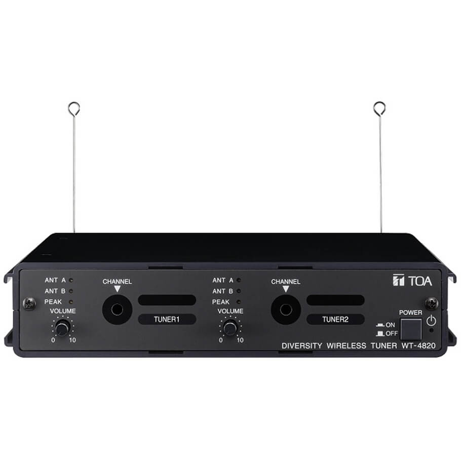 The TOA WT-4820 diversity tuner can accept up to two optional wireless tuner modules of UHF band (WTU-4800). It can be mounted in a component rack using an optional mounting bracket (MB-WT3, MB-WT4).