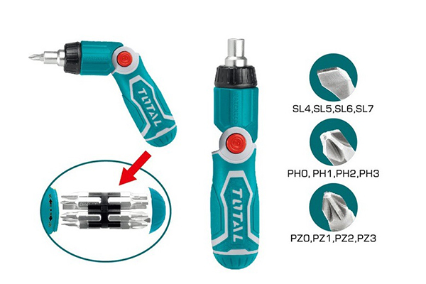 - Được gia công tỉ mỉ bộ tua vít gấp mang thương hiệu Total với các chi tiết tinh tế, đảm bảo làm việc hiệu quả và không làm trầy xước bề mặt vật liệu.