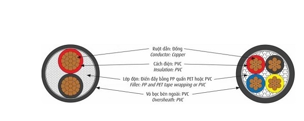 - Cáp điện lực hạ thế 0.6/1kV, TCVN 5935-1, 3 lõi pha + 1 lõi đất, ruột đồng, cách điện PVC, vỏ PVC.