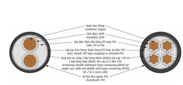 - Cáp điện lực hạ thế có giáp bảo vệ 3 lõi pha + 1 lõi đất, ruột đồng, cách điện XLPE, giáp băng thép bảo vệ, vỏ PVC.