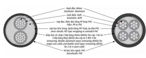 - Cáp điện lực hạ thế có giáp bảo vệ 0.6/1kV, 3 lõi pha + 1 lõi đất, ruột đồng, cách điện PVC, giáp băng thép bảo vệ, vỏ PVC.