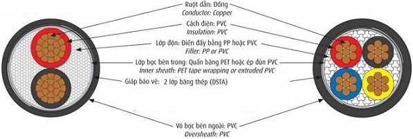 - Cáp CVV/DSTA dùng cho hệ thống truyền tải và phân phối điện ngầm, cấp điện áp 0.6/1 kV, lắp đặt cố định.