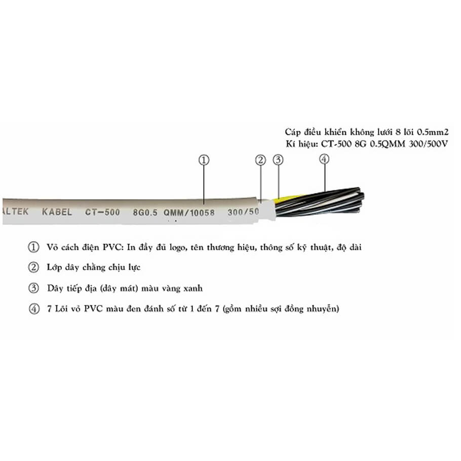 - Dễ nhận biết và thi công: Trên vỏ cáp in đầy đủ thông tin như thương hiệu, loại cáp, tiết diện; các lõi có màu sắc khác nhau giúp đấu nối nhanh chóng.