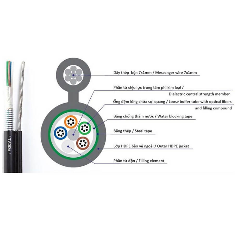 - Cáp quang treo kim loại Singlemode FOCAL được dùng như cáp treo ở những tuyến cáp quan trọng hoặc những đoạn băng rừng, nơi có nhiều sinh vật gặm nhấm.