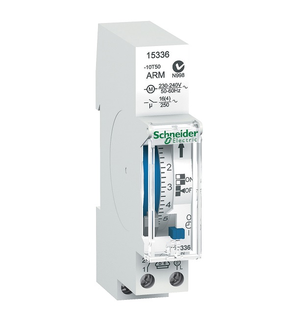 - Công tắc hẹn giờ Schneider có thiết kế dạng module gắn lên Din rail, khả năng chịu tải lên đến 16A, có thể lắp vào các tủ điện âm tường.