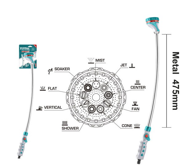 - 9 kiểu phun cho mọi nhu cầu tưới: Phun sương, làm ướt, phẳng, thẳng đứng, hoa sen, hình nón, quạt, trung tâm, tia phun.